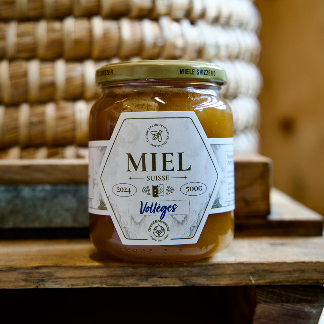 Ein zu 100% naturreiner Blütenhonig, mit grosser Sorgfalt in den Bienenstöcken des Imkerei-Kompetenzznetrums in Vollèges geerntet und mit dem Label Grand-Entremont (Wallis) ausgezeichnet