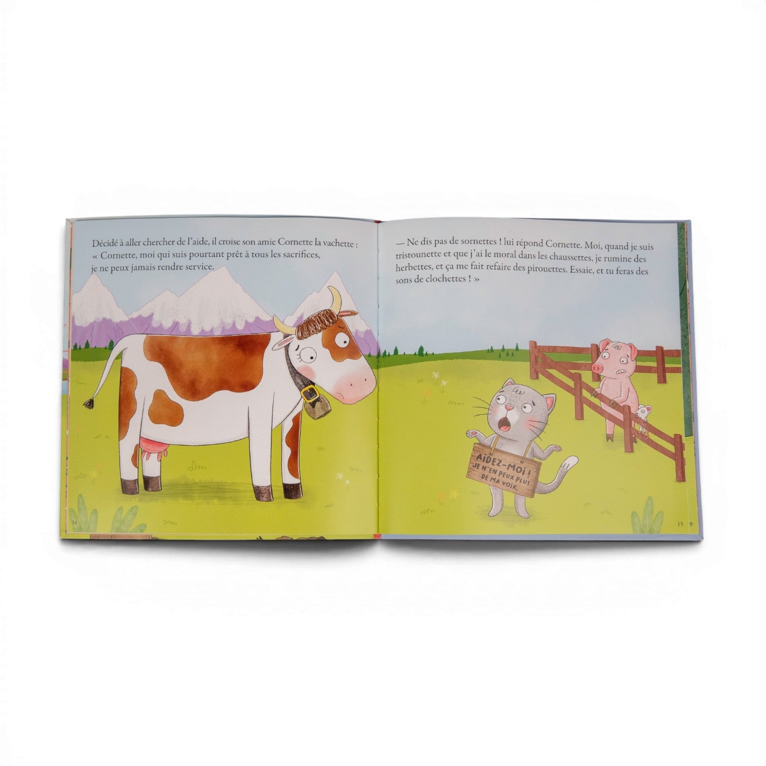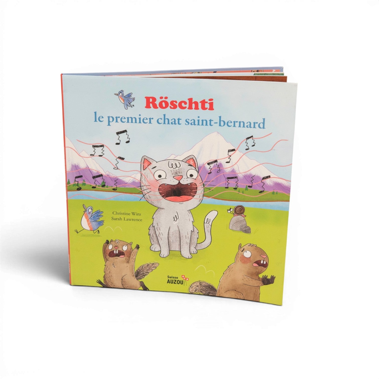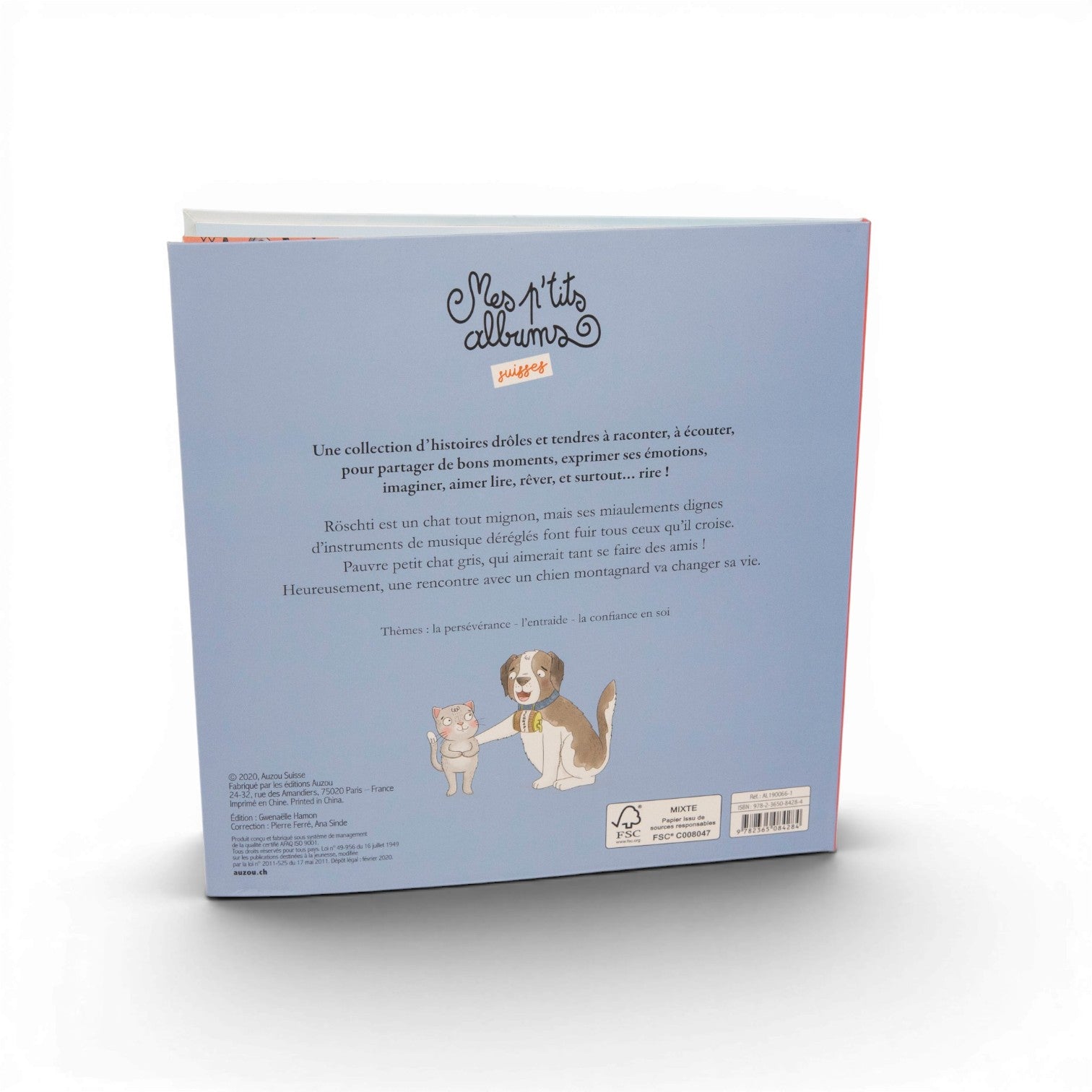 Röschti is a very cute little cat, but his meows, worthy of out-of-tune musical instruments, make everyone he meets run away. Poor little grey cat who would love to make friends! Fortunately, a meeting with a mountain dog will change his life.