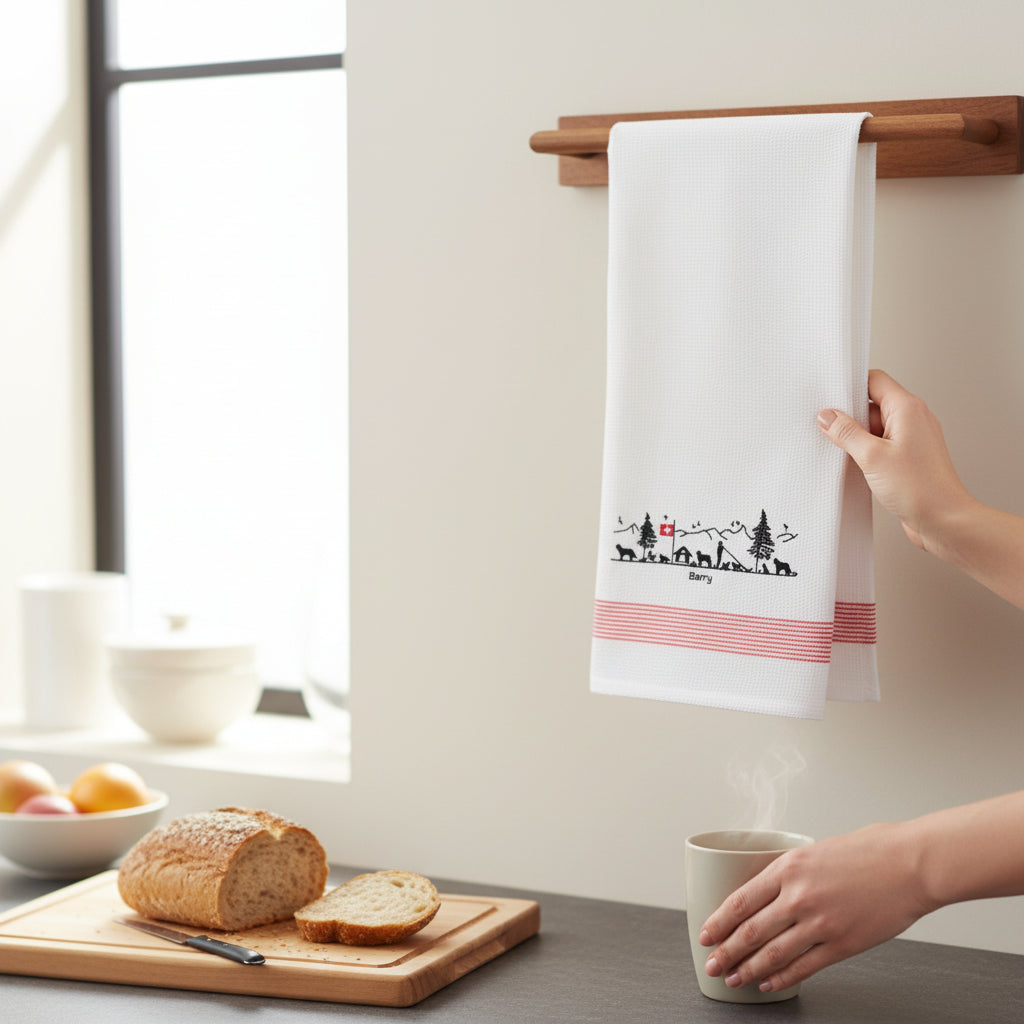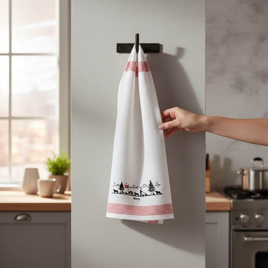 Waffle cotton kitchen towel featuring a finely embroidered Barry poya depicting St. Bernards, inspired by traditional Alpine decorations.