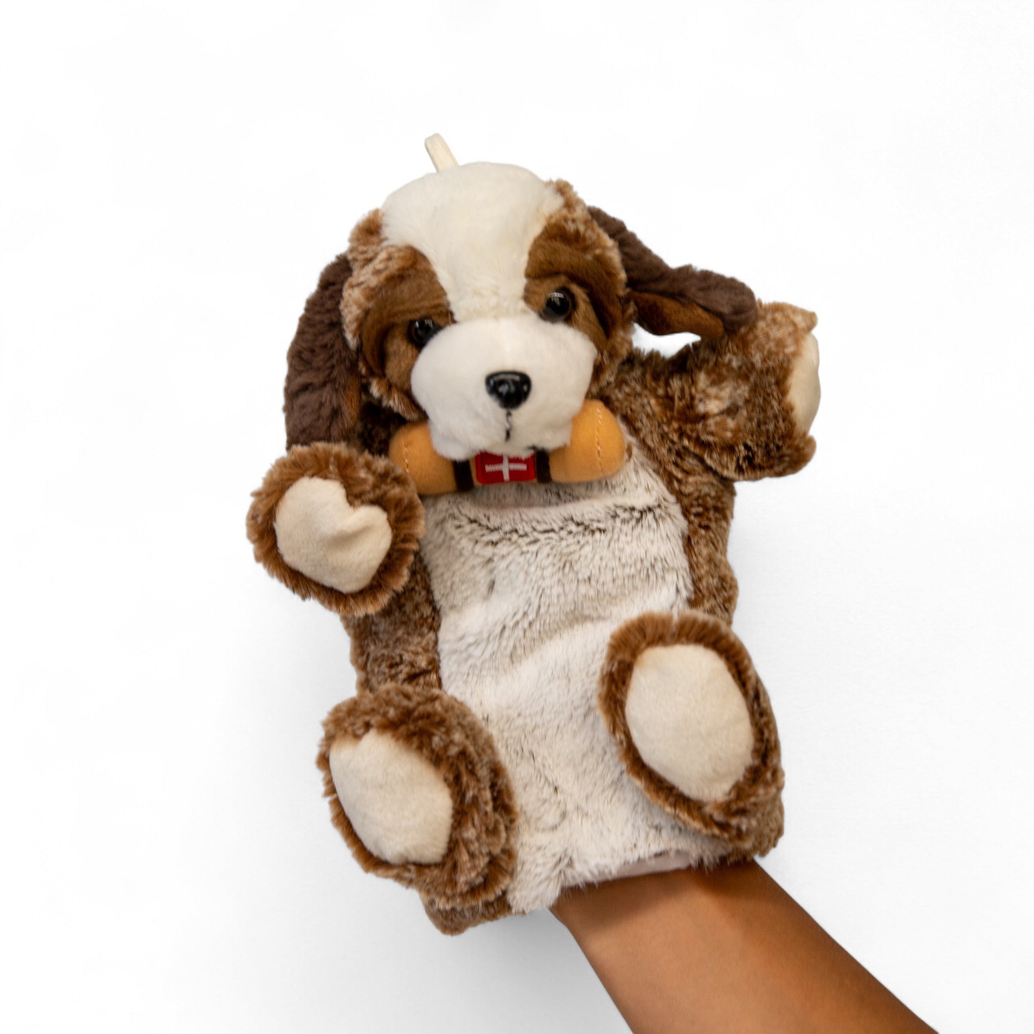 Marionnette Saint-Bernard avec son emblématique tonnelet, réalisée dans une matière douce et agréable au toucher.